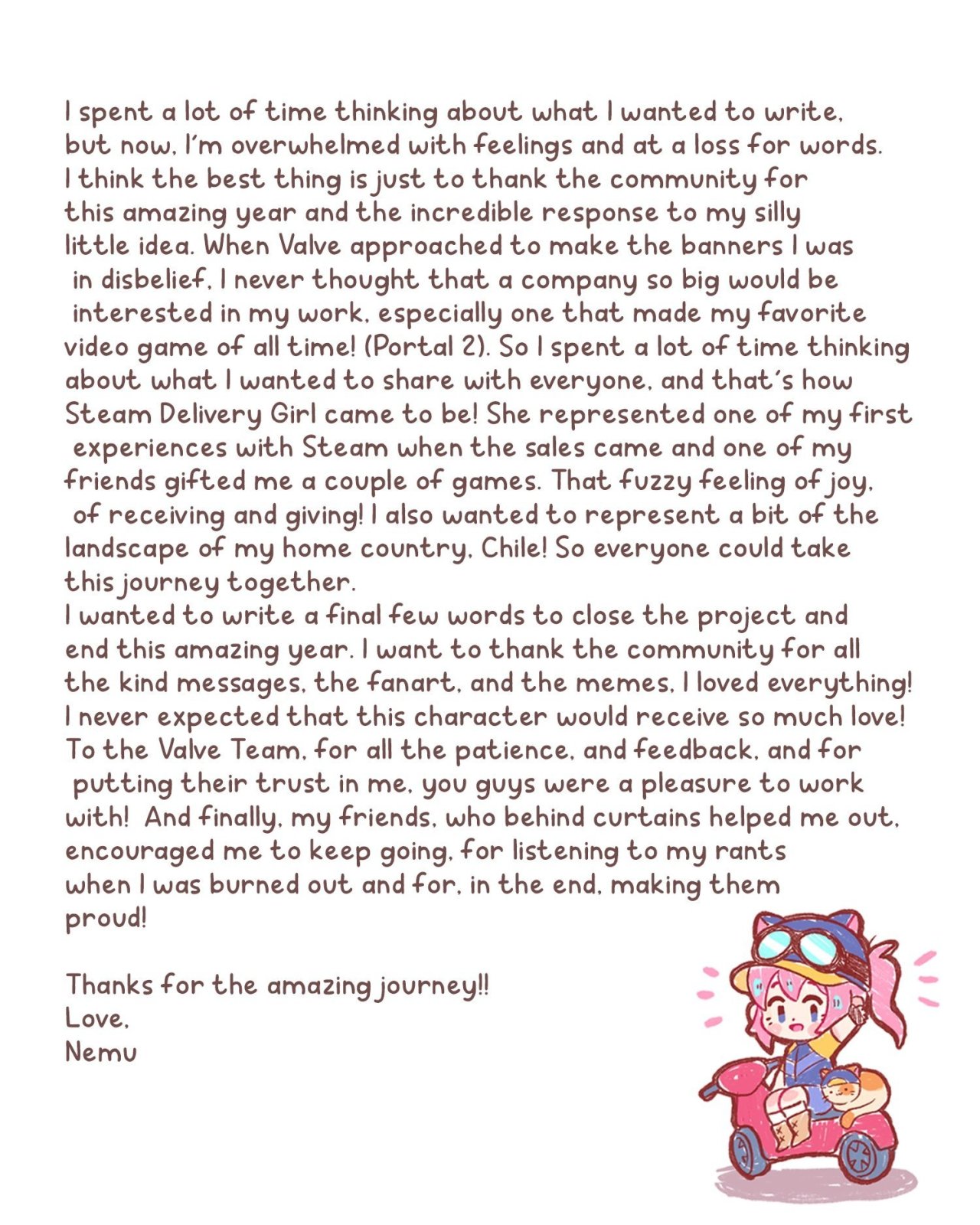 随后,Nemu发了一段长文来感谢为steam工作这一年受到的关注和帮助,感谢粉丝们的喜欢