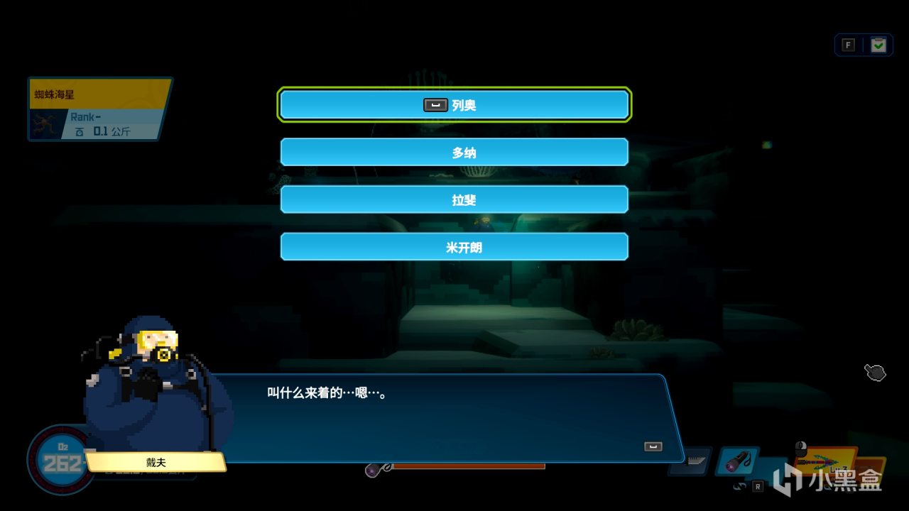 当我们让楞皮龟冷静后,在后面我们出去捕鱼时,会遇到兹奇在外面喂食楞皮龟,这里会让戴夫回忆楞皮龟的名字,选项中有:列奥、多纳、拉菲、米开朗。