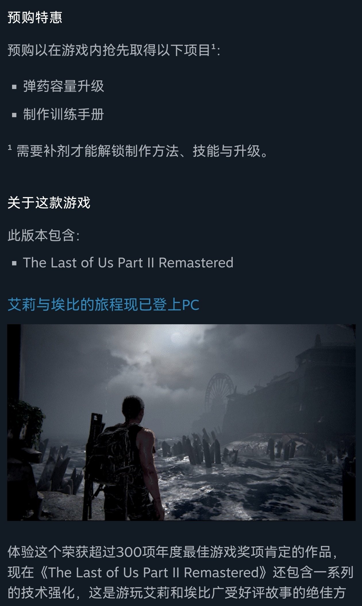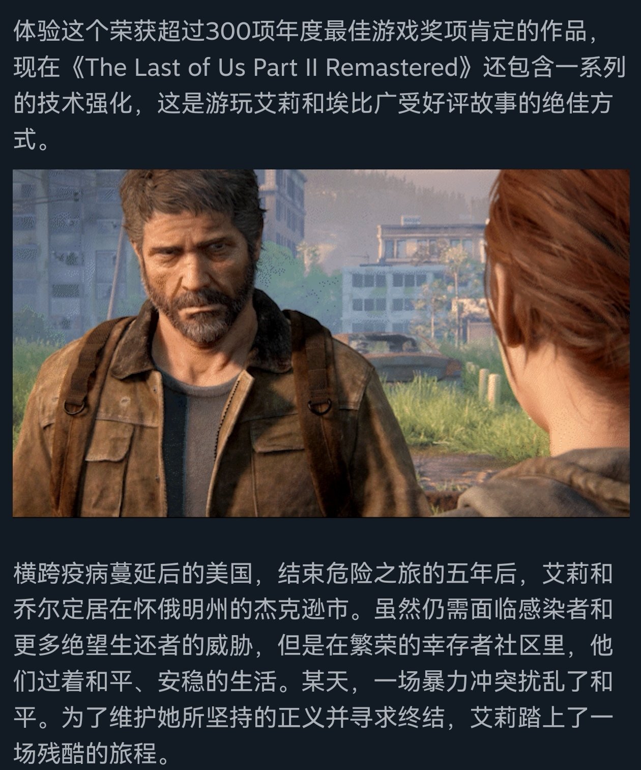 大家好,就在今天的凌晨,《最后生还者2重制版》开启了Steam预购,价格为345元,《最后生还者2重制版》为2020年6月18日发售的原版的《最后生还者2》的重制版。