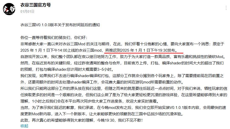 盼星星盼月亮,玩家们终于在2025年1月1日等到了这个长达五年的MOD,可当玩家们打算第一时间去体验MOD时,却被告知MOD被推迟了五个半小时,推迟理由是打包和编译超出预期,这就给人一种制作团队临时抱拂脚的感觉。