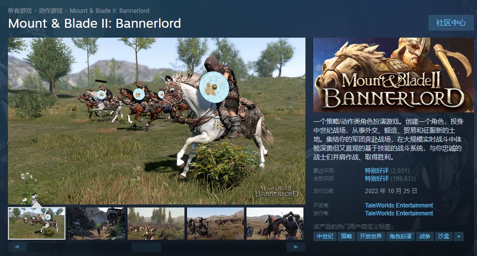 先来简单介绍一下骑砍2,全名为《骑马与砍杀2:霸主》,是由T社(TaleWorlds)开发的一款中世纪扮演游戏,它不光具备非常有深度的策略玩法,同时还有着极高的自由度,在全球范围内都深受玩家们喜爱,2020年3月游戏开启了抢先体验阶段,最终于2022年10月发布正式版本,截至目前总共收获了进20W条评价,87%特别好评的成绩。