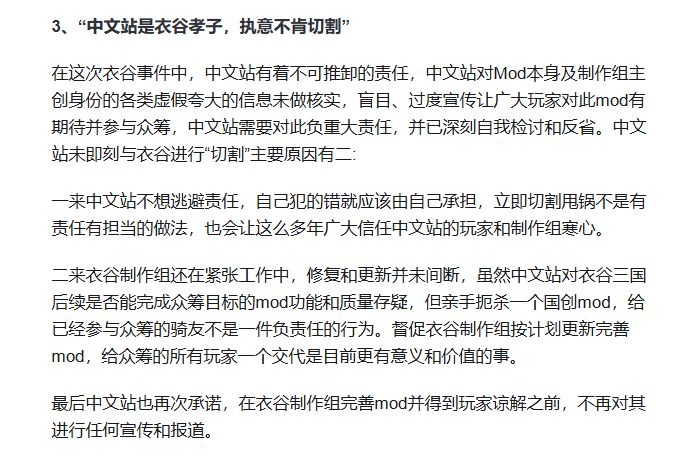 第二个被冲的就是骑砍中文站,理由是一些玩家觉得中文站在没有看到任何实际成果的前提下,就一直大肆宣传MOD,在明知出了问题后还帮着衣谷说话,这种行为与帮凶别无二致。