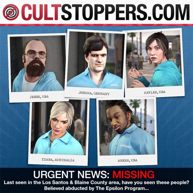 之后的9月6日R星在新的网站 cultstoppers.com 上宣布有5个来自世界各地的普通人在洛圣都“离奇失踪”。并了附上了照片,疑似被斜角绑架,而他们正是上述活动的幸运儿,以NPC的形式加入了游戏中。