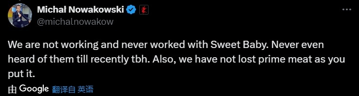 工作室目前并没有与Sweet Baby进行合作,也从未跟他们合作过,说老实话,我第一次听说sweet Baby这个事情,而且我们并没有失去优秀员工