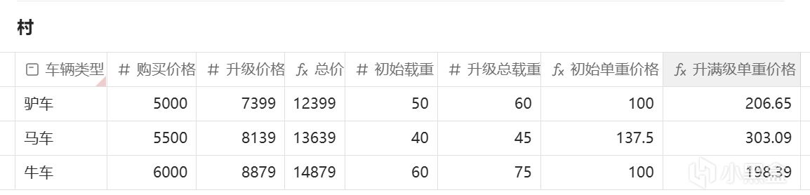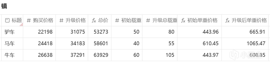 牛车的购买价格和升级价格都是驴车的1.2倍,但是单位时间载重量在最高等级也只有驴车的1.14倍。理论上来说均衡的驴车的性价比最高。
