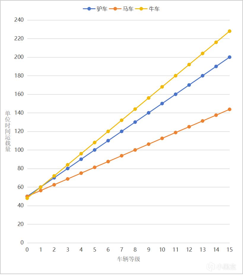 由此可见,在0级的时候,牛车的单位时间运载能力不如驴车和马车,在1级的时候,牛车与驴车齐平,之后的等级都是牛车一路领先。牛车贵有贵的道理的。