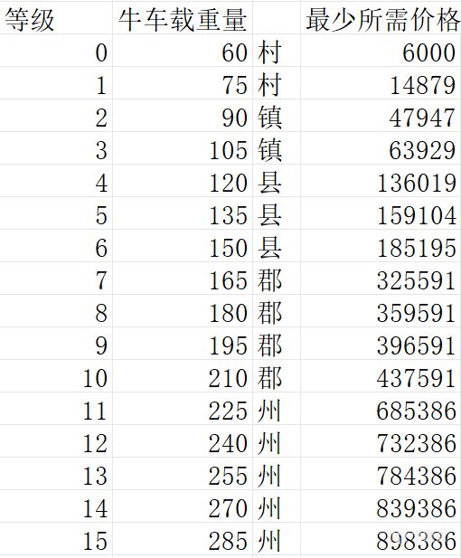 而到了“镇”,你需要花26638才能买到初始载重60,属性跟“村”一模一样的牛车,只是多了升级上限,还要再花钱升级才能增加载重,升满级的单位载重价格也飙升到了600+。