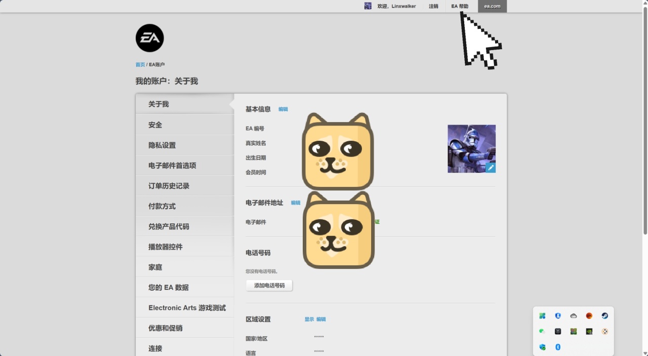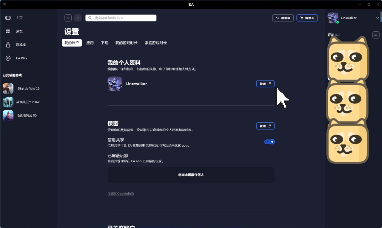 首先打开EA客户端客户端,我的个人资料界面点击管理