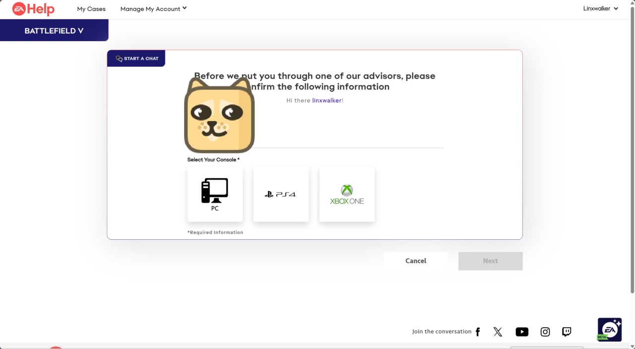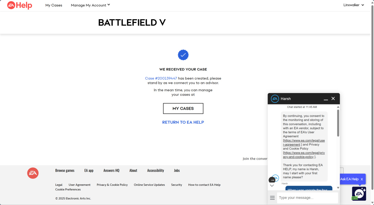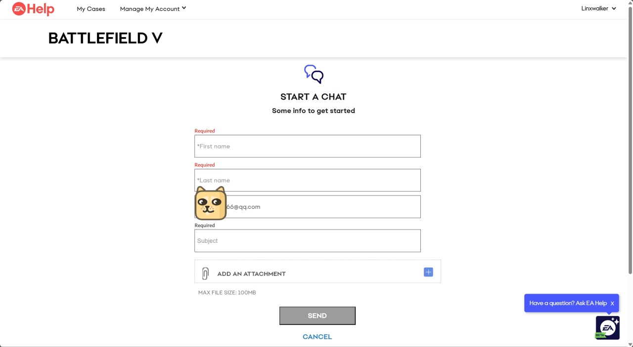 发送后再等待一会,就会有一个EA客服的弹窗,他会问你一些简单的问题,包括邮箱,姓名什么的,问你有什么事可以把上面的主题再发一遍