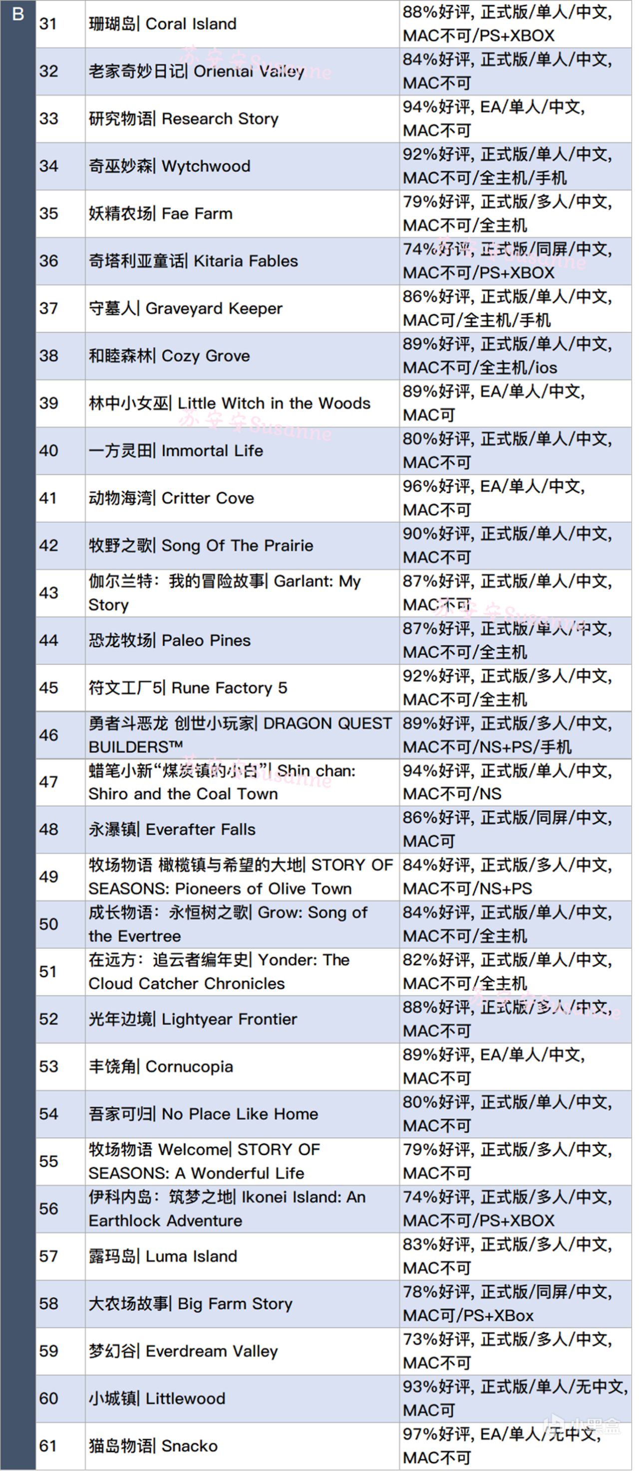 十几年种田爆肝之作,不少游戏也可以在我的B站主页搜到更详细的评测或是实况,个人喜好评分、欢迎欢迎留言探讨哦