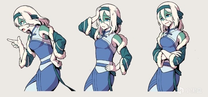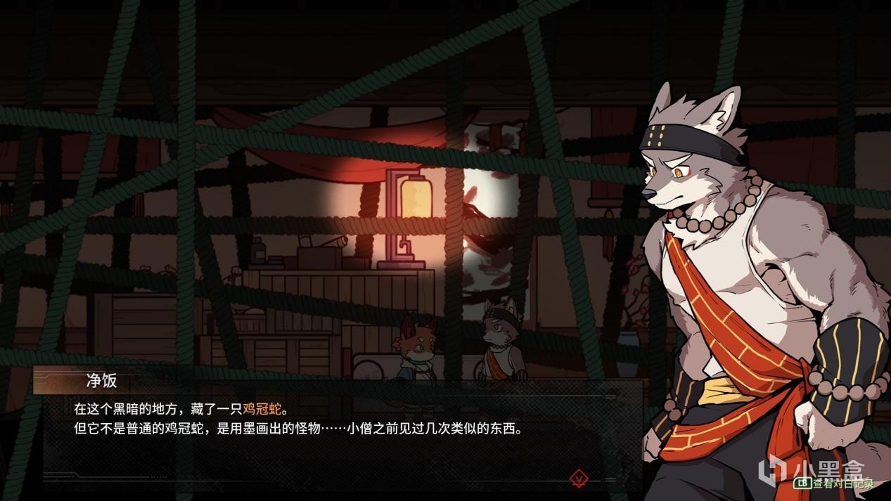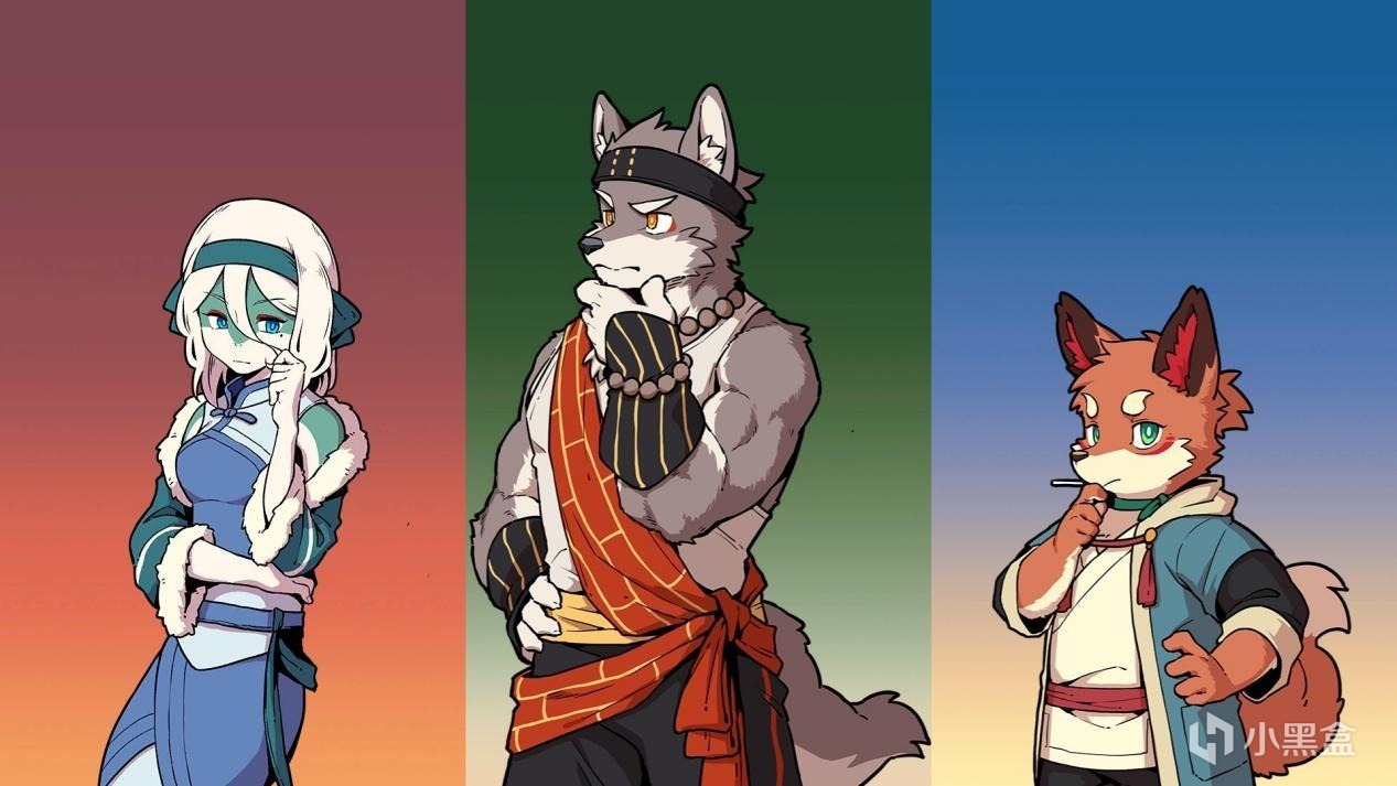 表现得最讨喜的地方,可能是角色在立绘上的呈现。小狐狸道士三宝、狼和尚净饭,和蛇画师皮月羞,对我来说在外观上最吃香的是狐狸三宝,属于光看立绘你就基本能get到性格萌点都在哪里的类型,而在设定上最有趣的则是狼和尚净饭,擅长的是在说出蠢话或者做出蠢事后闭着眼“善哉善哉”——所以你可以看到他展示出的3张立绘里,有2张都在闭着眼睛果咩那塞。