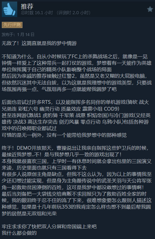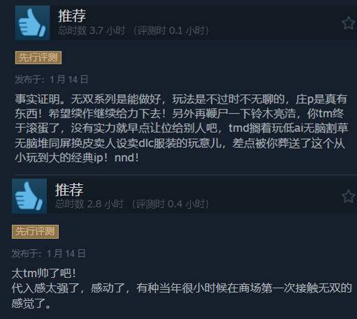 截至发稿前,《真三国无双:起源》在Steam的评价为“好评如潮”,在658篇玩家评测里有96%为好评。有给出评价的玩家认为,《真三国无双:起源》简直就是自己的梦中情游,其游戏类型让自己心动不已。除此之外,《真三国无双:起源》结合了无双和卧龙的集合体,还反思了《真三国无双8》的缺点。“最强!最爽!”