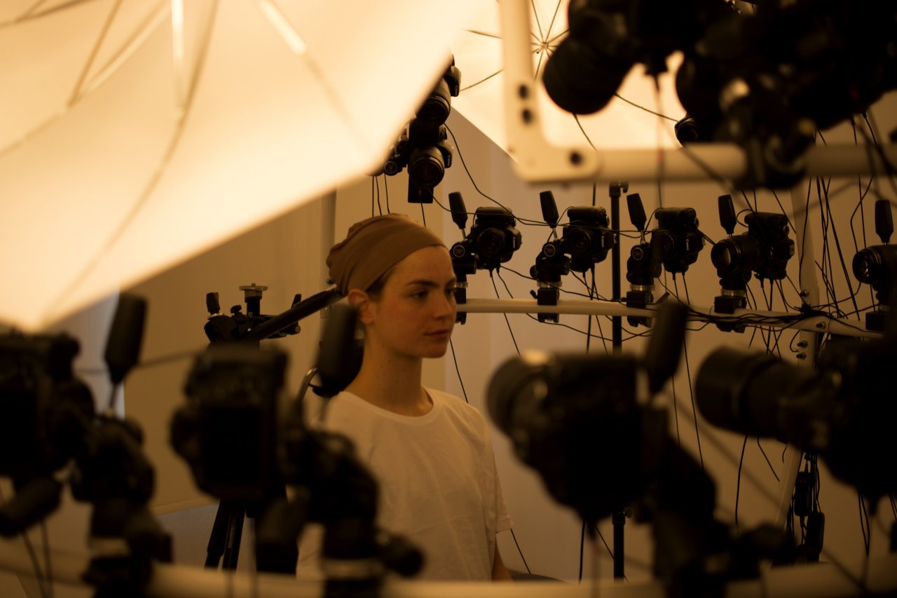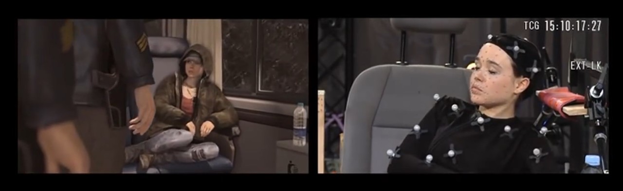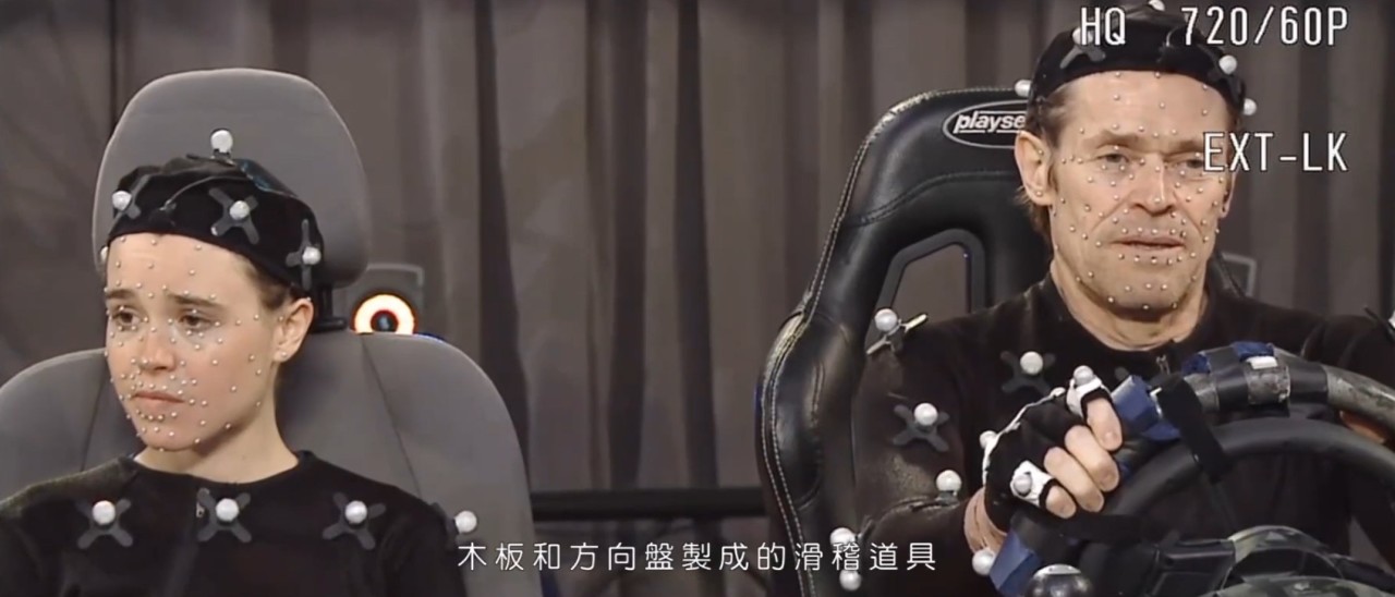 摄影棚里,穿上动捕服和在脸上加上小球体的艾略特·佩吉