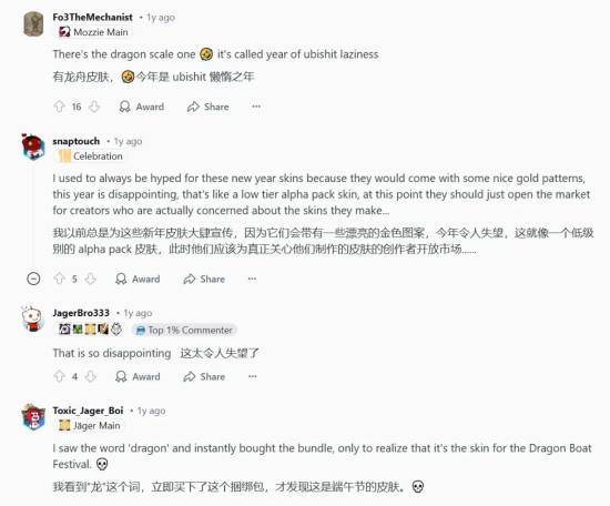有较多老外表示,对今年的生肖捆绑并不满意。因为几乎没有蛇的相关元素,而用韩文写的“蛇”字也并不适合大部分玩家。并且,今年的皮肤一眼能看出来是受到“韩国文化”的启发,而不是中国的春节。