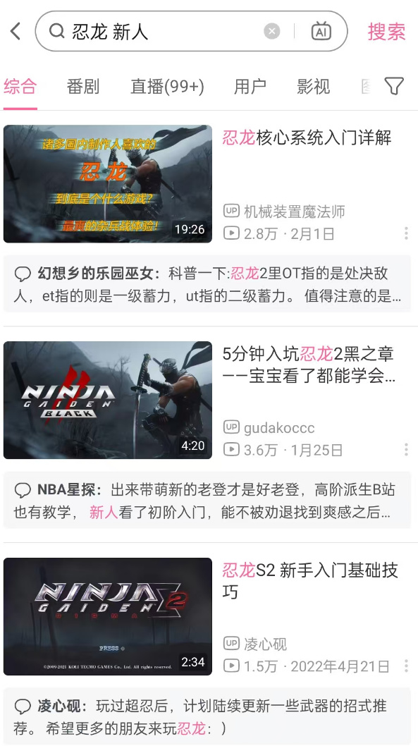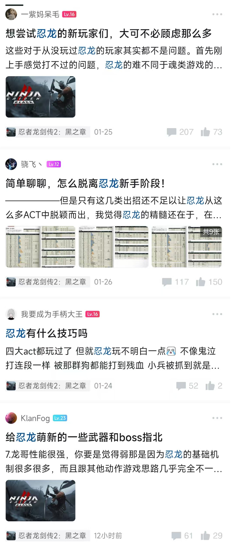 这两部作品构成了彼此最好的宣传。尤其是忍龙2推出重制版,连带着忍龙相关的新手攻略也迎来了一轮重制。不仅视频攻略有着还算不错的播放量,在那些文字论坛上,你也能看到诸多类似“看见忍龙不要怕,新人学了这几招也变爽游”的帖子,也能见着确实有不少新人以此为契机入坑,分享心得和吐槽,一改以往谈及忍龙必称“硬核ACT”的整体氛围。