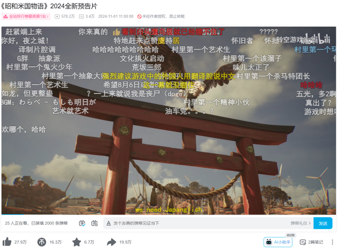 去年11月1日,铃空游戏放出了《昭和米国物语》的第二支预告,仅是在B站上的播放量就接近600万。与此同时,自《黑神话》之后,海内外市场对国产游戏的关注提升明显,加之《昭和米国物语》恶搞美日文化的题材太过新鲜,也引发了不少海外玩家的讨论。