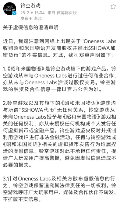 下午,铃空游戏也在海内外账号上发布了正式公告,表示Oneness Labs所言均为不实信息,《昭和米国物语》从始至终未与“SHOWA币”产生过任何关系。