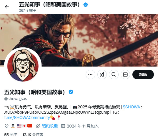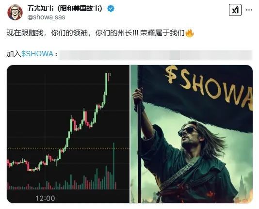 这支预告吸引来的显然不仅仅是玩家,也包括一些投机分子。正是在PV公开后不久,X上已经出现了一个顶着游戏里“德克萨斯州州长五光”头像的账号,开始高强度宣传SHOWA币。