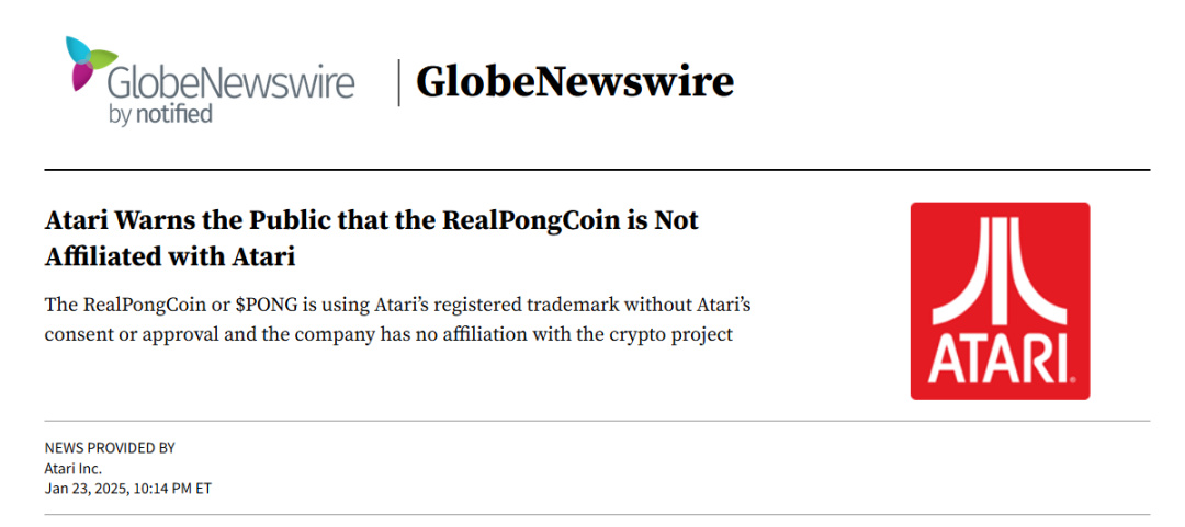 随即,雅达利公司(Atari)便公开声明RealPongCoin(或$PONG)与自己并无关系,强调该项目未经授权使用了其注册商标PONG,并警告公众该项目可能误导消费者。