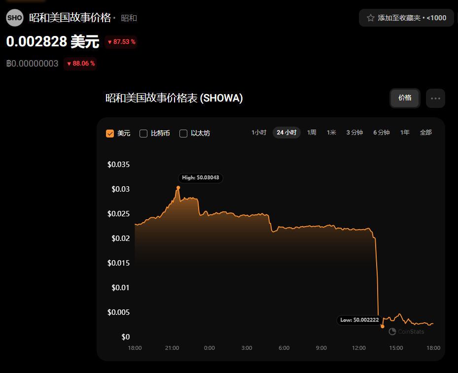 而在今日辟谣后不到几小时,“SHOWA币”的市值已经光速跌至冰点,跌幅超过90%。