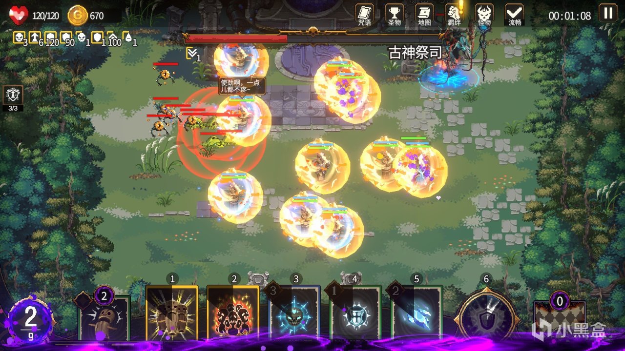 每次游戏开局之前,都可以随机自己想要的牌组。虽然无法指定选择想要什么牌,但多随机几次,总能成功的。在本作中,战斗是自动进行的,角色会自动去攻击周围的敌人。期间,玩家可以通过点击卡牌,来指挥角色释放各种咒语。在我们的平时理解里,卡牌游戏与自走棋是两个半杆子打不到一起的游戏类型。一个回合制,另一个却是半即时制,这两个类型的游戏究竟要怎么才能融合到一起呢?《咒语回声》这个游戏给出了自己的答案,那就是独特的热力机制。