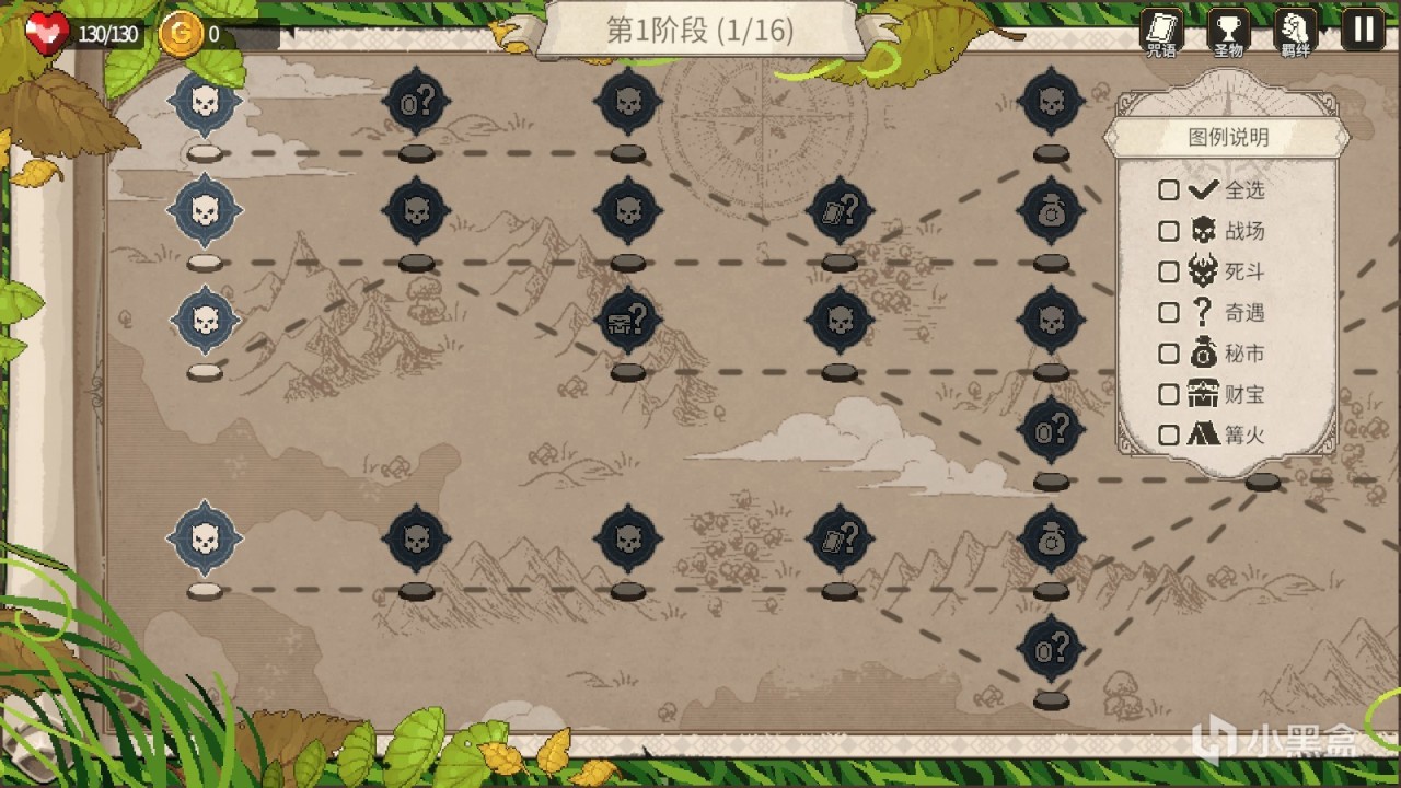 与大多数的爬塔游戏一样,本作也是可以选择路径的。由于游戏中的行走路径是完全没有迷雾的,所以玩家在游戏的最开始就可以去规划一个阶段的所有行径路线。当然,本作也提供了多样化的事件来丰富玩家的体验。在本作中,事件大概有以下几种:“战场”是普通怪,战胜之后可以获得咒语和金钱;“死斗”是精英怪,强度比普通更强,但是会掉落更加稀有的咒语、更多的金钱,还有圣物;“奇遇”就是其他游戏里常见的随机,包括生机奇遇、咒语奇遇、圣物奇遇等;“秘市”就是商店,可以购买咒语、淬炼咒语、移除咒语,是游戏里组成卡牌的重要途径;“篝火”是休息的地方,可以回复生命、合成咒语、淬炼咒语、删除咒语。