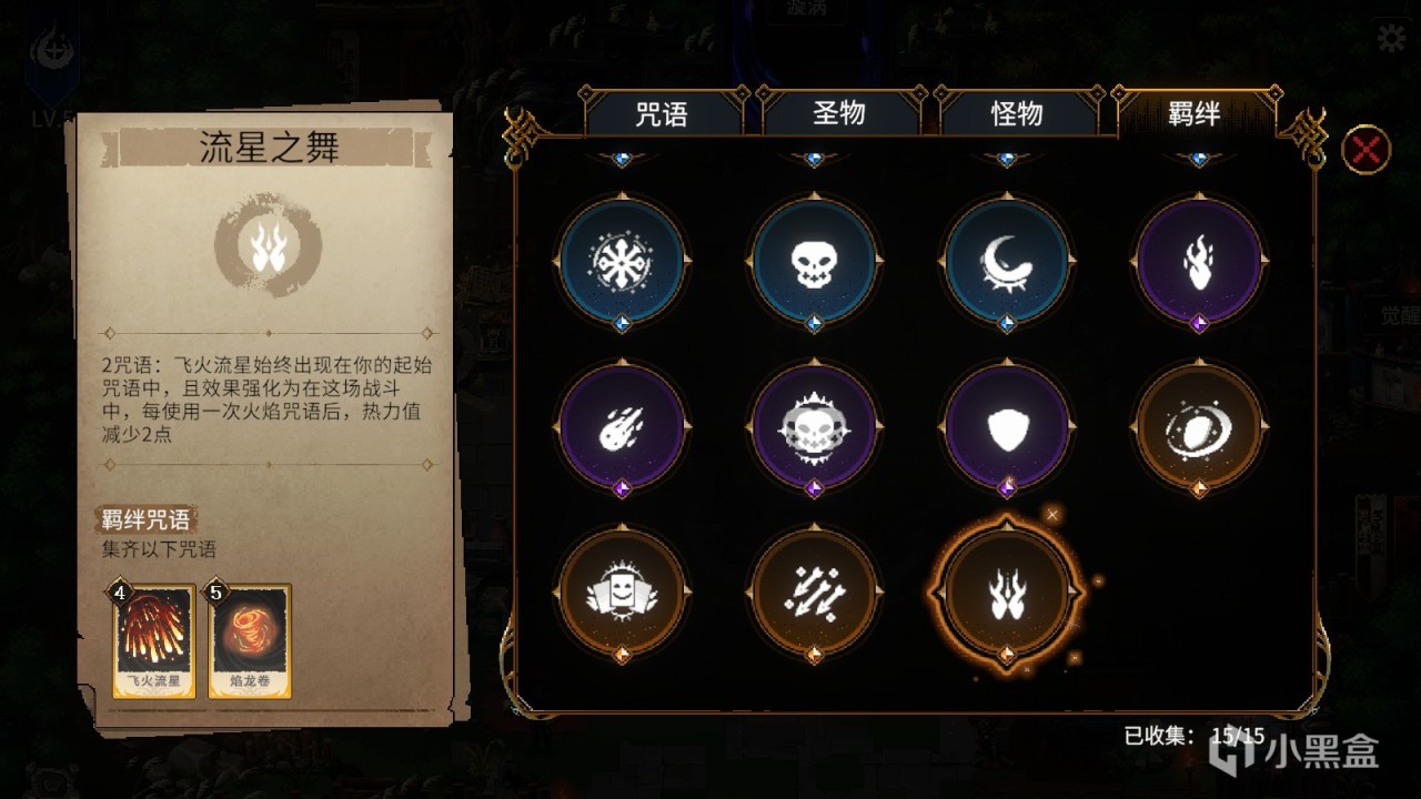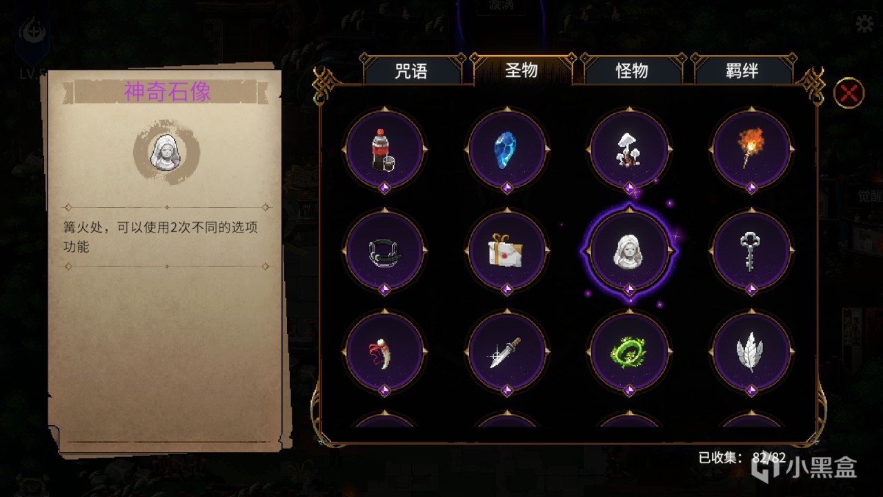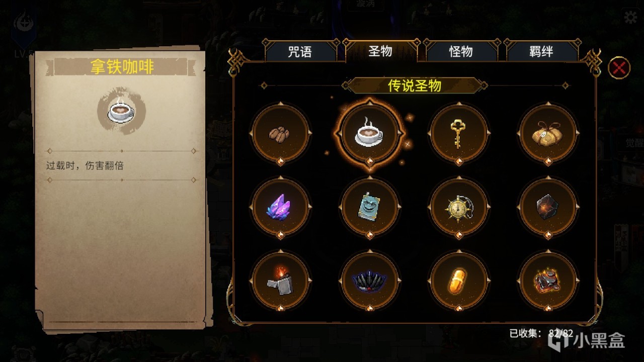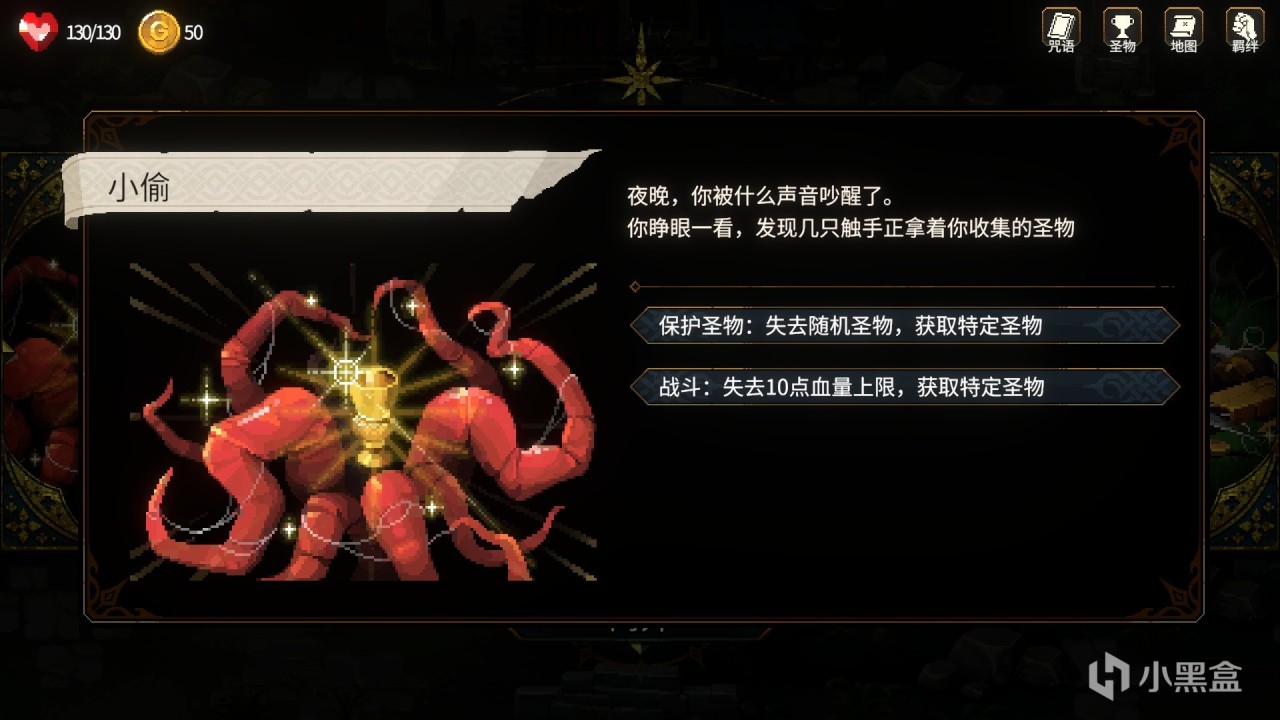 对于传统的爬塔游戏来说,珍贵物品带来被动效果,是很常见的设定。在冒险过程,玩家可以获得获得各种各样的圣物:“西红柿”会让角色在进入战斗后,每4秒减少1点热力值;“神圣石像”允许角色在篝火处,能使用2次不同的选项……圣物的获取是完全随机的,玩家无法预知这局游戏能得到什么圣物。一般情况下,玩家需要根据本局得到的圣物类型,来谋划本局的咒语卡组,例如得到“勇者之心”、“火焰球”等强化烈焰的圣物时,可以尝试组建烈焰咒语卡组,想燃烧流;得到“红皮书”、“礼貌”等关联恶契的圣物时,则可以把恶契咒语变废为宝。另外,由于角色只能同时装备六个圣物,在游戏过程中,玩家更是需要圣物的组合要进行一定的抉择和思考。