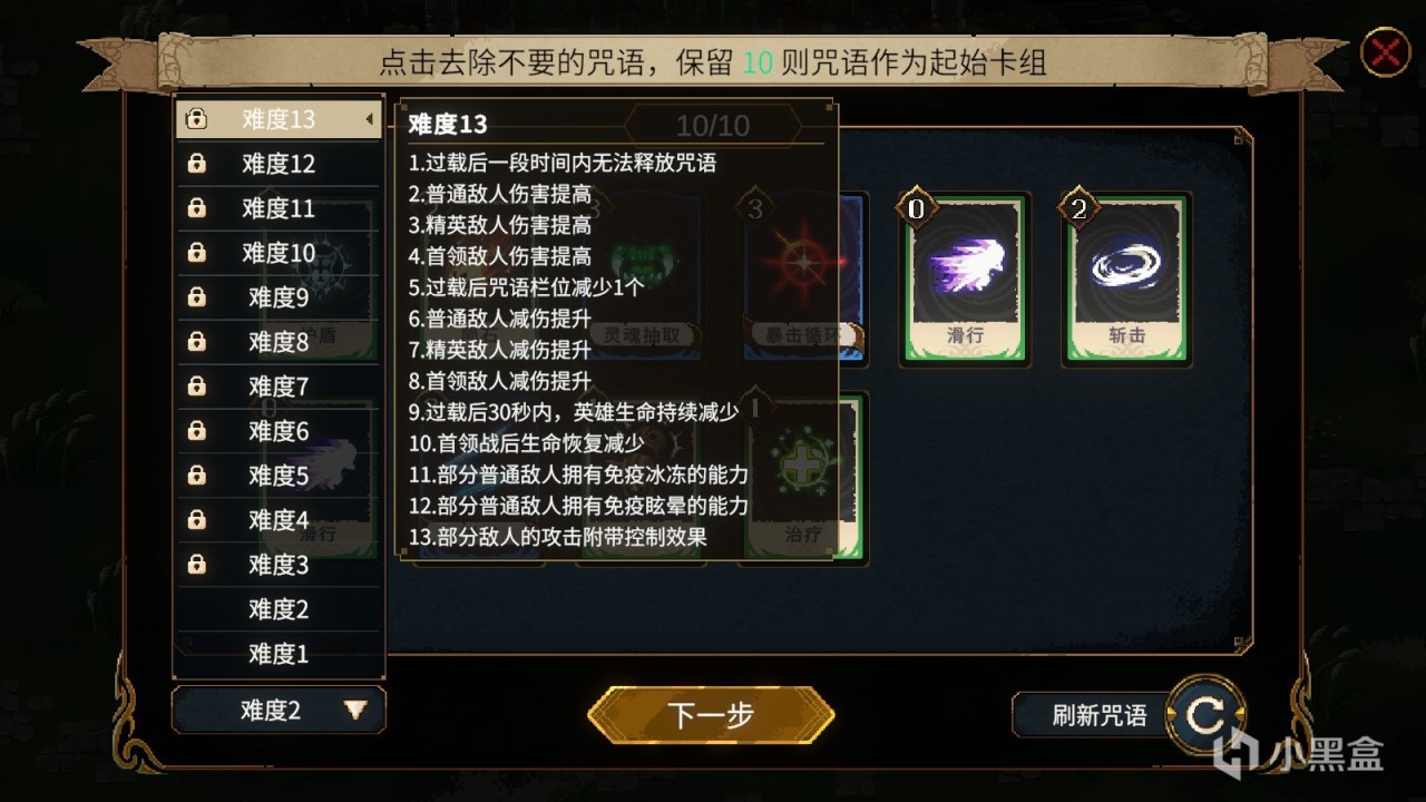 与大部分的爬塔游戏一样,本作也有着明确的难度设定。在目前的版本里,游戏共开放了13个难度,游戏强度都会增加一些,例如难度2会在难度1的基础上提高普通敌人的伤害;难度3会在难度2的基础上提高精英敌人的伤害。泾渭分明的难度层次,让玩家拥有明确的攀登感,增加了很多的耐玩性。值得一提的是,相比DEMO版本,那个被大家念叨的“过载后,咒语栏位减少1个”从难度1移动到难度5,大幅降低了游戏前期的策略门槛。