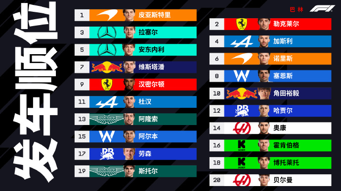 今天凌晨进行的三练和排位赛,皮亚斯特里仍以巨大优势排在第一,诺里斯第二,乐扣第三。排位赛中,阿尔本、劳森、博托莱托、斯托尔和贝尔曼在Q1被淘汰,奥康在Q2撞墙退赛,杜汉、哈贾尔、霍肯伯格、阿隆索和奥康被淘汰,角田冲进Q3;最终,皮亚斯特里以1:29.841的成绩夺得杆位,拉塞尔第二,落后0.168秒,勒克莱尔第三,落后0.334秒,安东内利第四,加斯利第五,诺里斯和维斯塔潘分别排在第六和第七。由于奥康撞车引发红旗后,拉塞尔和安东内利在重启时间尚未确定时提前驶入维修区快速通道,所以被罚退一位,勒克莱尔和加斯利升至第二和第四。