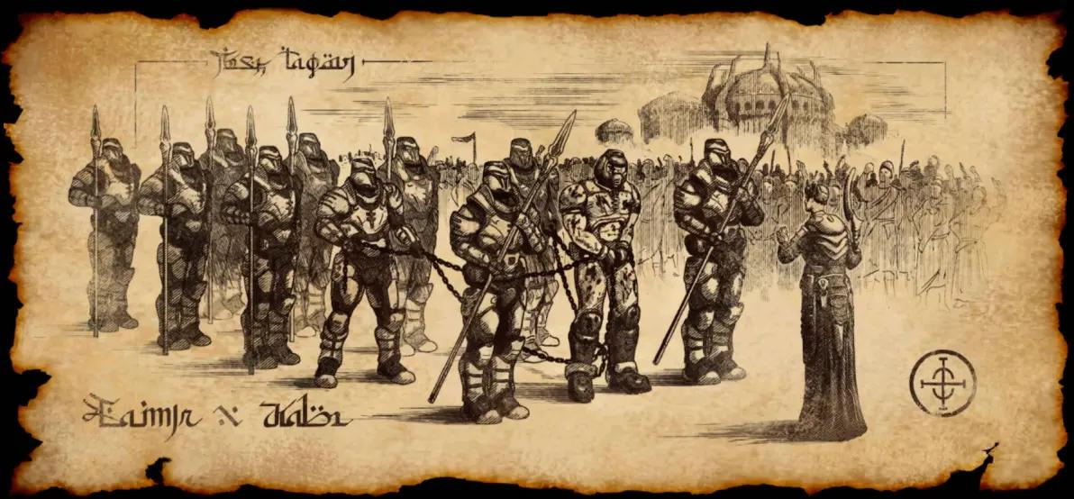 依据亚金律法,外来者要在大竞技场中厮杀以证明自己存活的价值。外来者做到了,他以顽强的意志克服伤痛并杀死了对手,由此获得了跟随暗夜守卫们征战边疆并传播信仰的权力。他在竞技场的出色表现也引来了梅克族女王的注意。