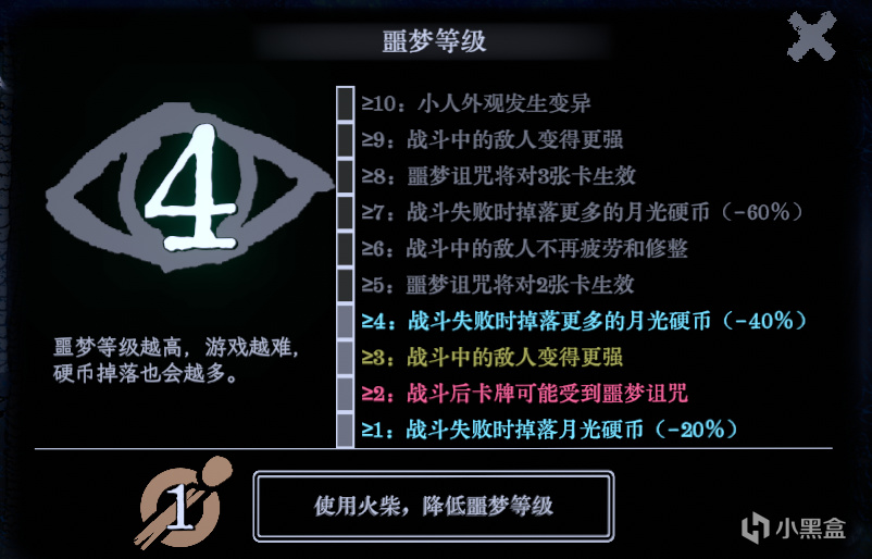 游戏开局只有故事和标准两个难度可以选,但不代表本作就没有高难度的模式了,只是这个难度机制实装到了游戏的【噩梦等级】里,并且可以用火柴减少难度(本人游玩时还以为这是什么资源管理系统,于是火柴就留到boss战前用,导致战斗几乎没有难点)也就是说如果你想要挑战最高难度那么就不要用火柴,保持你的噩梦等级一直维持在十点,当然因为本作的难度设计很亲民,如果有一定的卡牌游戏经验哪怕是一直十也不会觉得有多难。