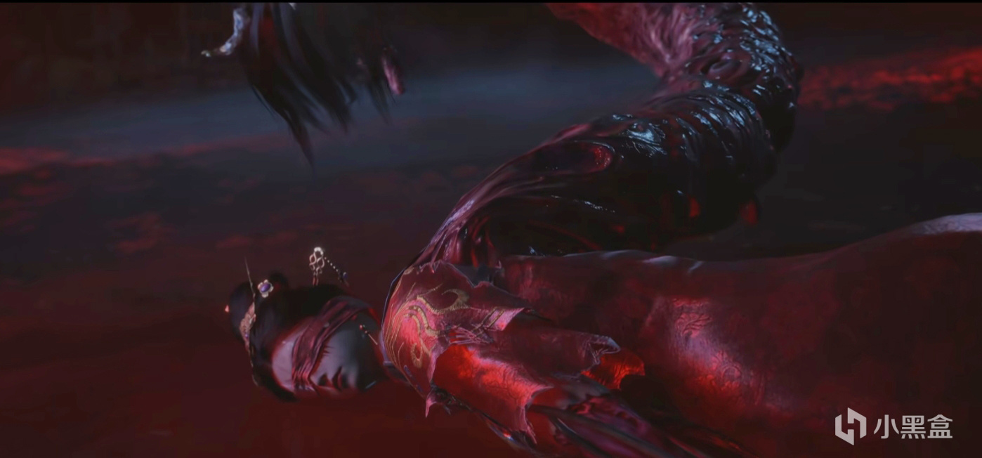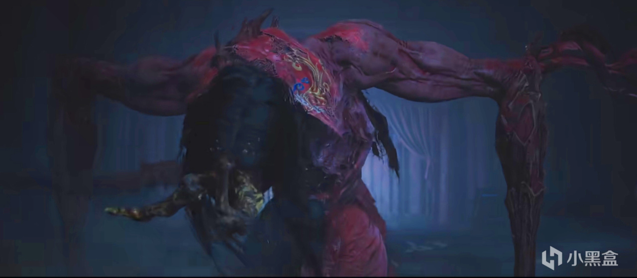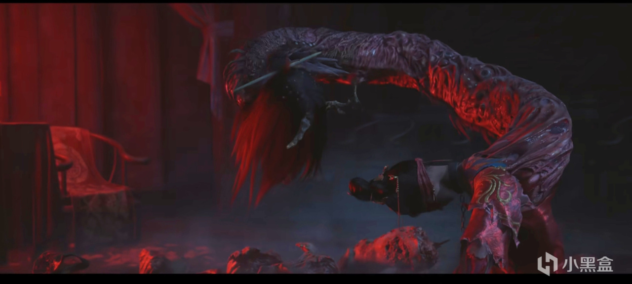 更让我觉得视觉冲击强大、恐怖感倍增的地方,则是在BOSS进入二阶段前,它提了提宿主(可能是)方灵,发现她站不起来后,便直接破体而出。