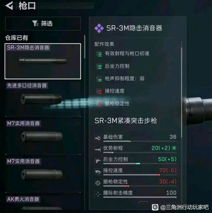 其次就是所有消音器在不同类型的枪械上所能改变的属性并不是完全一样的,例如标注消音程度弱的轻语战术消音器装在步枪上可以降低150米的枪声,增加7米的射程。但装在冲锋枪上就只能增加4米的射程和降低90米的枪声了,装在狙击枪则是降低180米枪声增加27米射程不过其他属性例如后坐力之类的还是没有影响的。