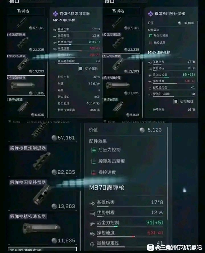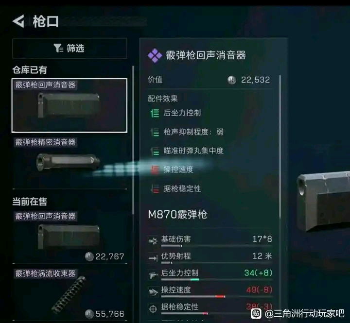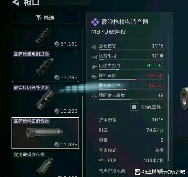 相当于精密消音器的加强版,但是优点可以降低瞄准时的弹丸散布,在打独头弹时可以更准一些,搭配他只要两万的低廉价格还是蛮不错的。