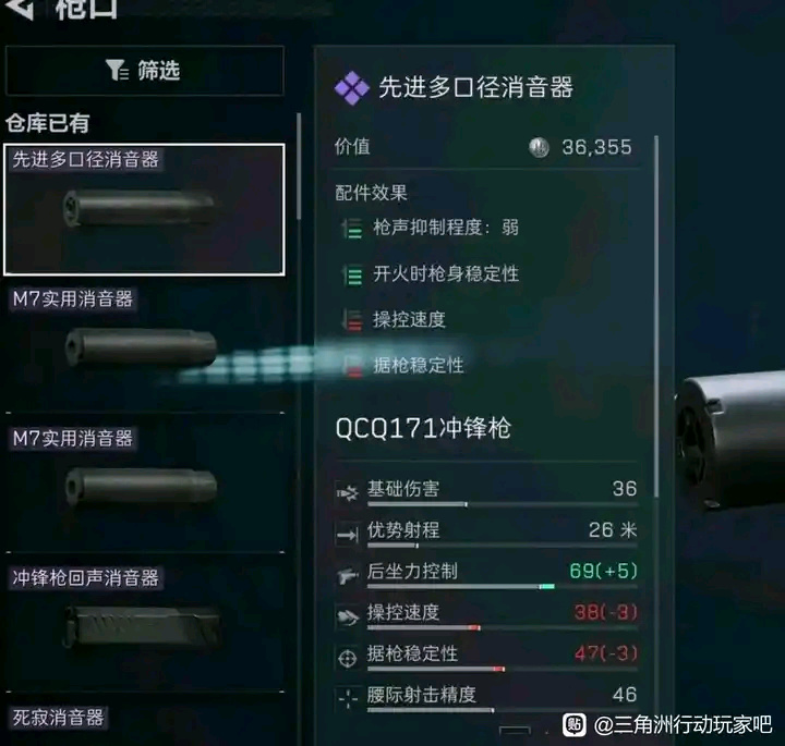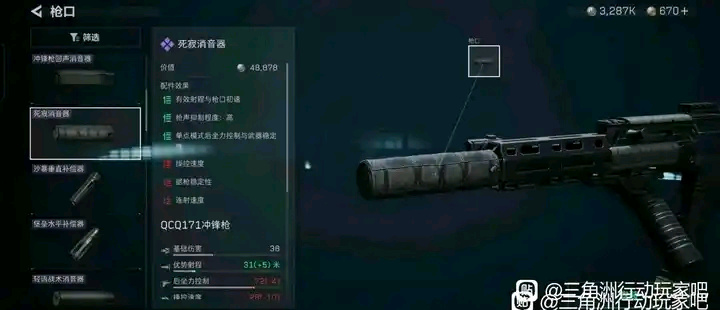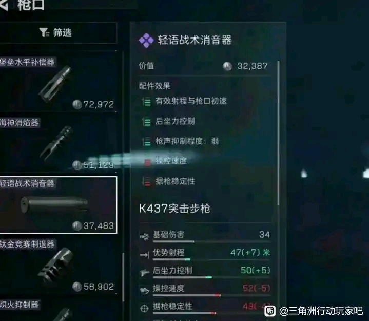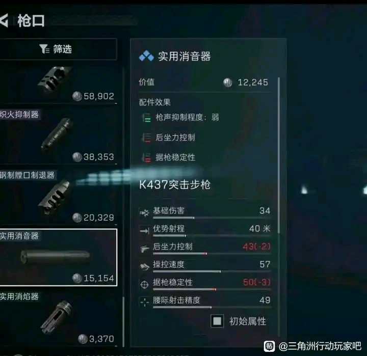 比较通用的消音器但三万的价格才能提升八点后坐力控制的同时还要扣11的操控速度,这就让他性价比比较差,不过有个优点是他不扣据枪稳定性。如果不是非常缺据枪稳定性而且还需要消音的话不如直接加点钱换更高级的消音器。