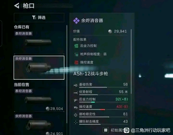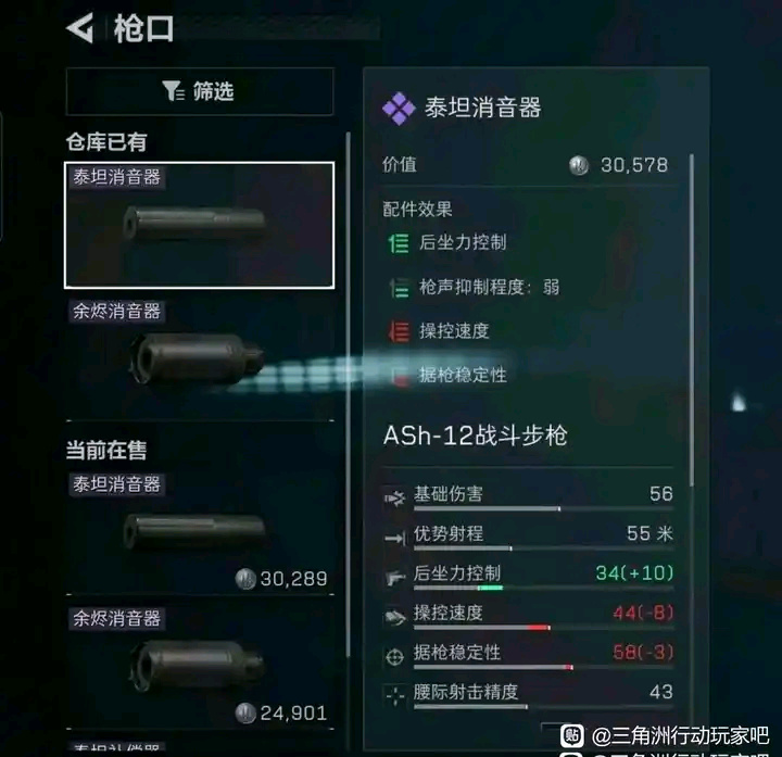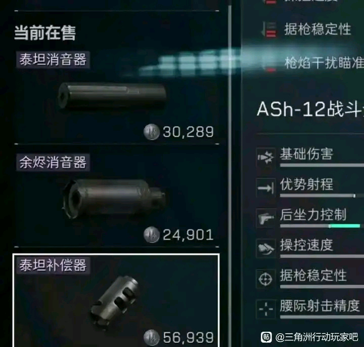 ash-12专属消音器,加装之前的枪声600米加装后420可以说降低明显。虽然只加八点后坐力属性只有泰坦补偿器的一半但他的价格只有泰坦补偿器的不到一半!而且比起泰坦补偿器还有这消音和不扣据枪稳定性以及消焰的优势可以说性价比相当不错,