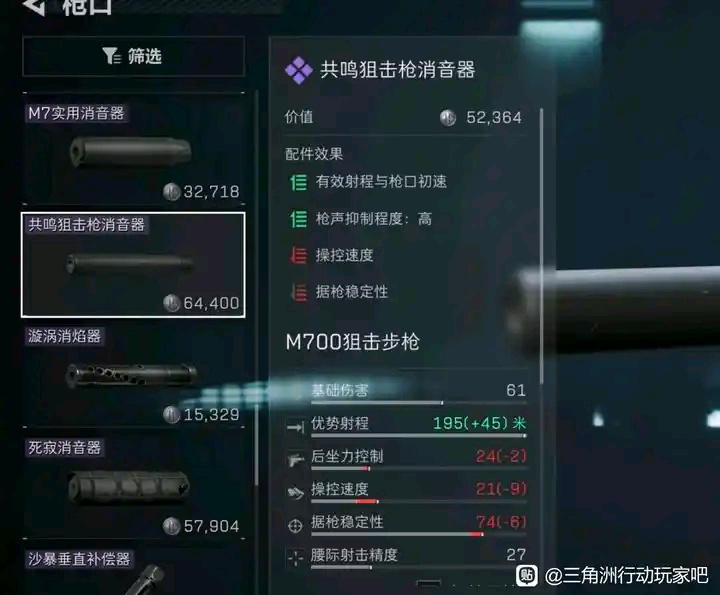全游戏最强狙击枪消音器属性非常高,可以极大幅度的提升枪口初速和射程但价格同样也是最贵的一档。 和死寂消音器比起来各有优劣,他可以适应更多的战斗场景而死寂消音器基本只能打远距离狙击。