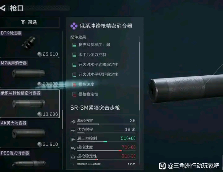 虽然长的离谱看起来像枪管但他确实是消音器,这个配件是sr-3m专属配件所以作为高级枪械的专属配件他的系统定价很高大概在四万左右,但他作为专属配件的属性又很差所以性价比特别特别差非常不推荐用,用他还不如直接加点钱上直接上最高级的冲锋枪回声消音器呢。