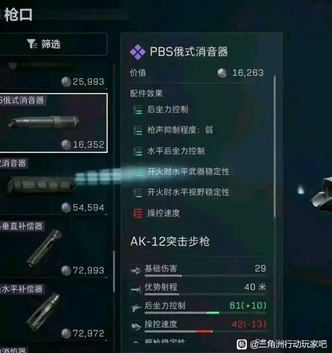 不管是性价比还是实用性超高的超强消音器,唯二的缺点就是仅限部分俄式枪械使用和降低的操控速度稍微有点多。这个消音器不光是实打实的增加十点后坐力面板,而且还有额外的水平与垂直后坐力补偿。而且重点是他只要不到两万就可以拿下!不到两万就能拿到那么多后坐力属性,不过代价是需要牺牲亿点操控速度,可以搭配高操控的枪械来弥补缺陷,而且还有附带的消音效果可以说这款消音器就是全游戏最强性价比消音器。