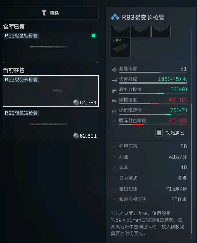 r93在改装后是全游戏射速最快的狙击步枪,但对应的缺点是他的射程最短弹速最慢下坠最严重。这把枪并不适合打远距离狙击而是更加适合打中近距离狙击,加装短枪管后他高达每分钟65发的高射速也相当于每秒都可以稳定开出一枪。在中近距离狙击式的优势极大容错率极高,就算没有爆头也可以通过多打几枪其他部位快速击倒以及补刀。如果非要拿他当远程狙击步枪打的话会非常难受,即使是加装长枪管也可以感受到明显的子弹下坠非常难狙人。所以这边只建议加装短枪管打中近距离狙击,如果打的准的话可以像cf那样瞬狙,不过因为枪械本身上限较低导致无论怎么改装都很难有较快的操控速度所以要打瞬狙的话还是不推荐用他。