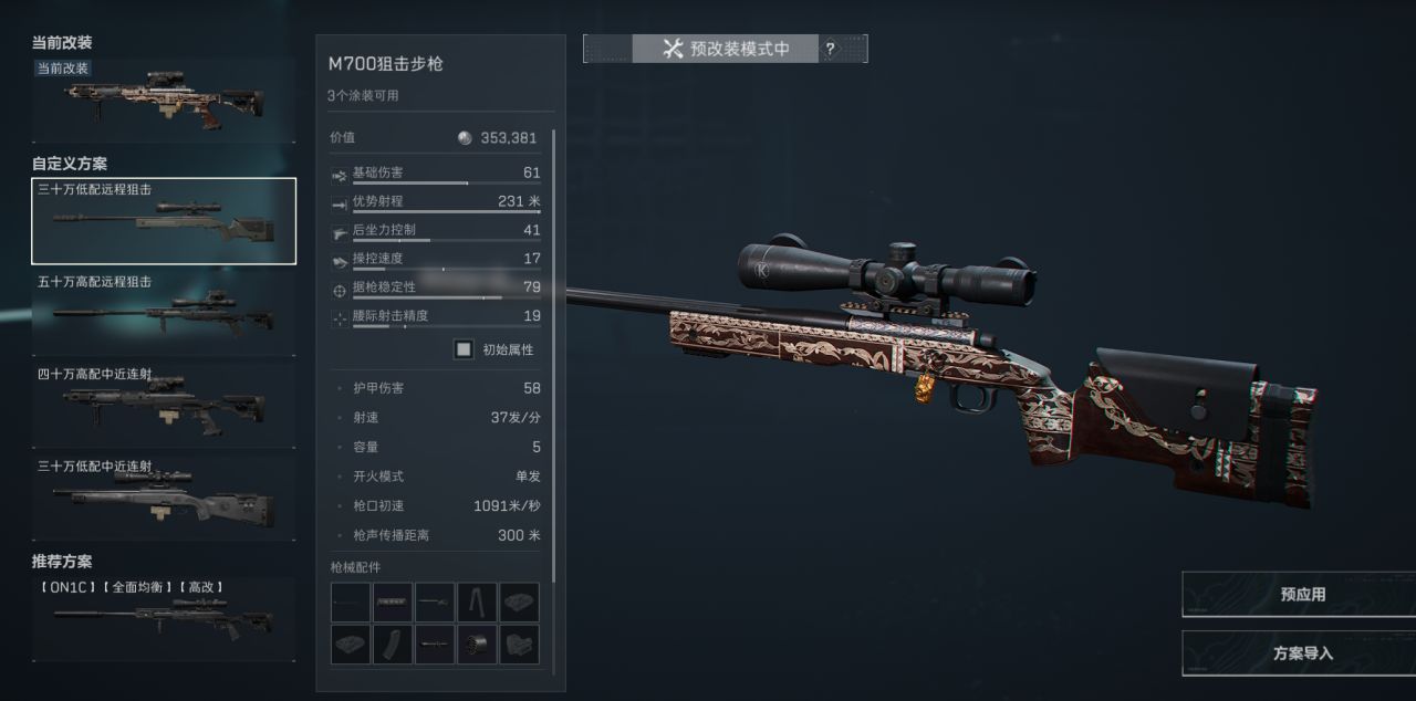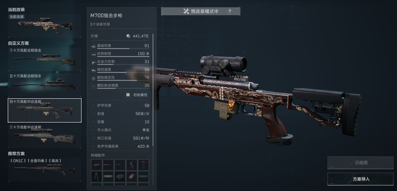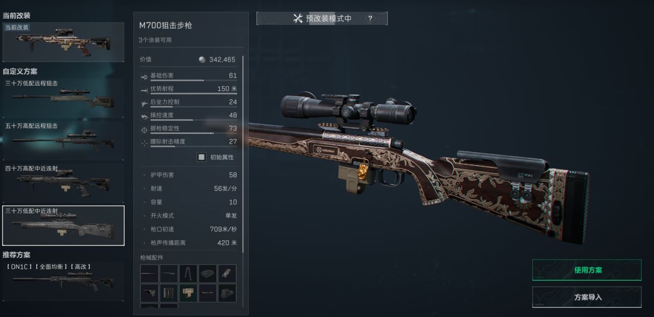 这套改装拥有快到极致的开镜速度可以像cf一样瞬狙爆头,在中近距离连射架枪也非常实用。优势射程虽然低点只有150米但是屏息一下打更远的爆头也是没问题的,瞄准镜可以换成自己喜欢用的其他的没必要改。