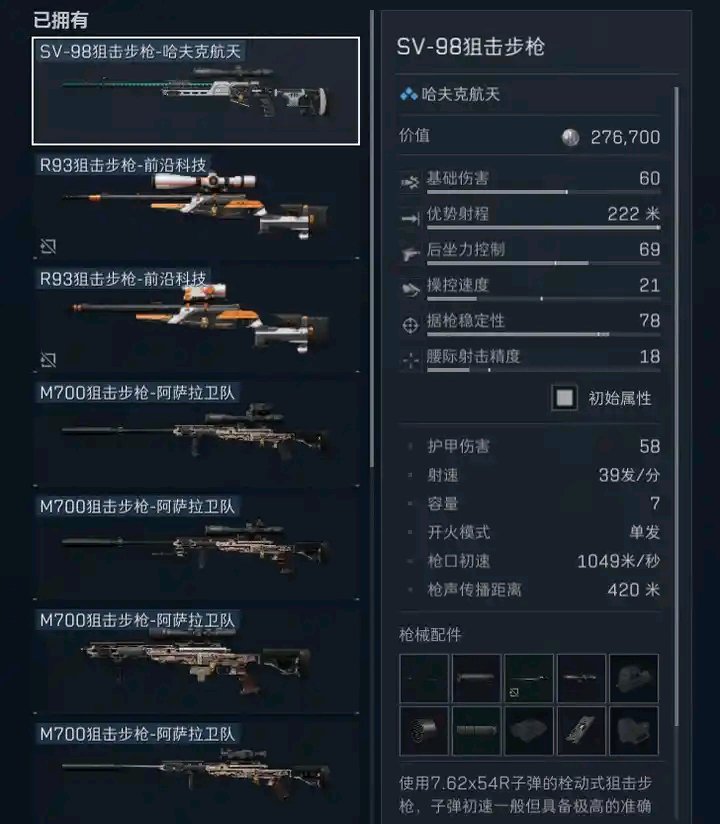 正经的廉价狙击步枪,不装枪管都有650的枪口初速堪比长枪管r93的715初速。改装过后1000多的弹速可以说两百米内指哪打哪很少需要担心下坠问题。这把枪的基础属性就很优秀不是非常有必要(最好还是装一下)长枪管来打狙,如果不想花高价买枪管的话那么只加装一个好点的消音器例如共鸣狙击枪消音器他的射程就非常够用了。而且还有一个非常好的优点就是sv98的脚架只需要7000多一个就可以随便买,r93的脚架要13000多而且还经常涨价。平时不用脚架的时候可以拆下来加操控速度,等需要稳定架枪狙击的时候在装上也是可以的。