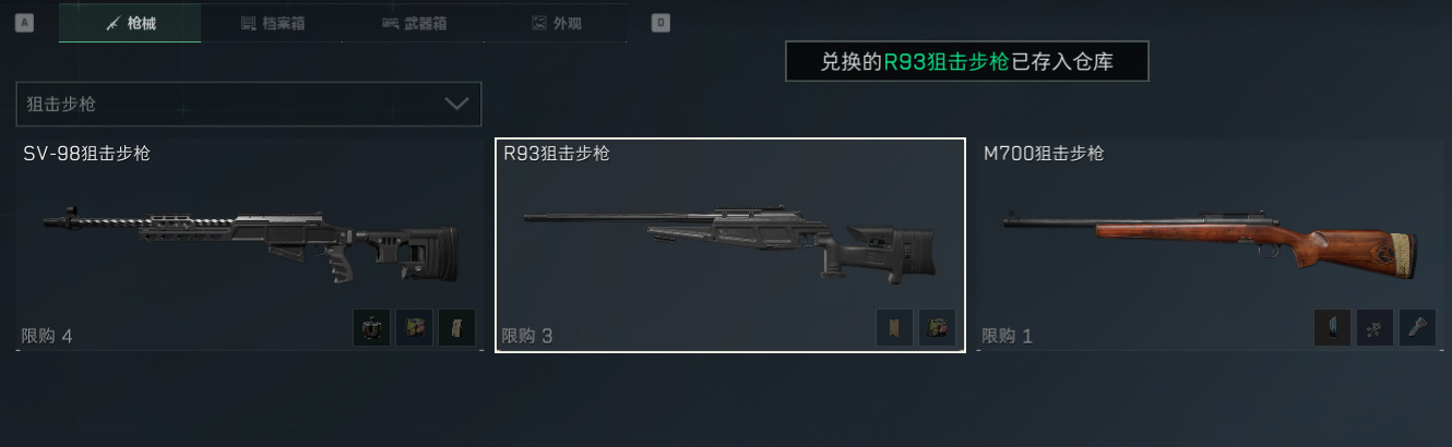 接下来要讲的两把狙击步枪都可以在军需处廉价兑换,没必要每次都去交易行花高价买。