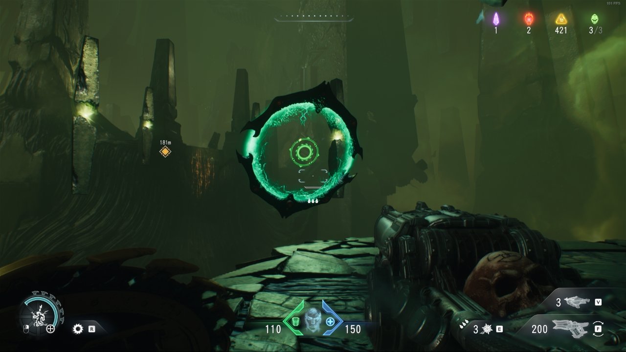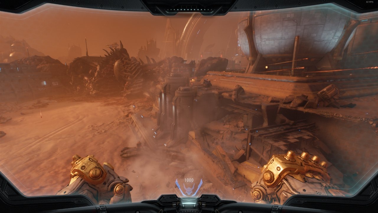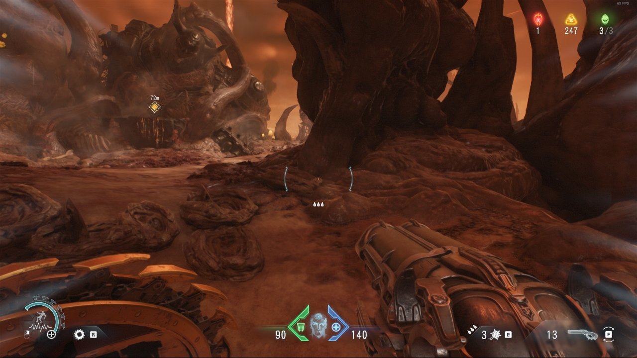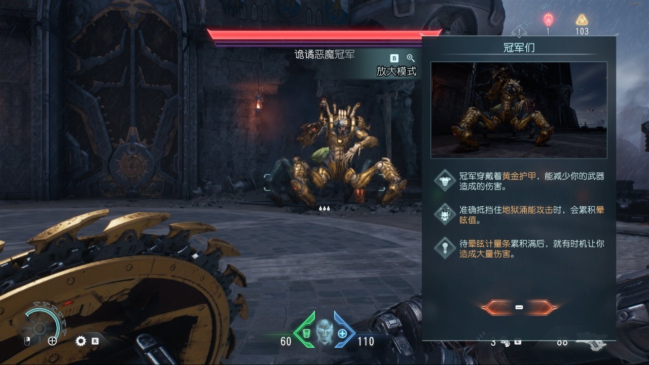 其实有这种感受倒也不完全是设计上的刻意为之,而是在武器上做出改变,基本都是重武器,不仅如此,本作主角从头到脚给人一种厚重感,尤其是当我从高空一跃而下时,犹如冲进羊群的重甲车,敌人在血舞中激发着玩家的肾上腺素,这种感觉如何不爽?当然,本作主角虽然看着笨重,但其机动性却超过前作,这一部分要归功于盾牌冲杀的缘故,但更多的还是在参数上让毁灭战士更加灵活。