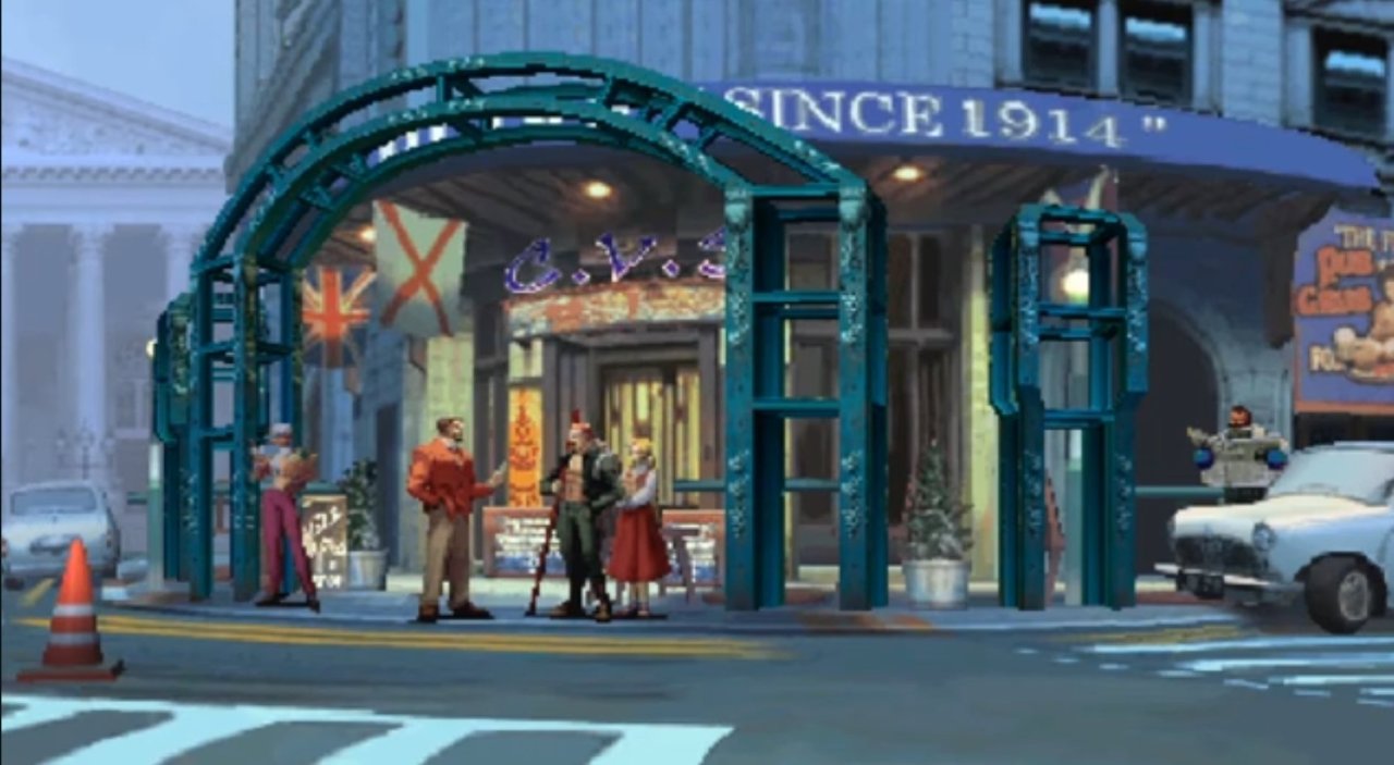 而在卡普空vsSNK 2:千禧之印的伦敦擂台中,我们可以看到艾琳娜正抱着什么东西站在场馆外面。