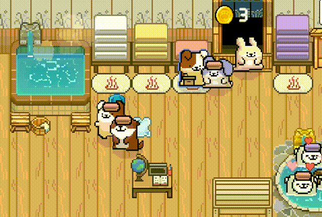 接着游戏解锁,第一次打开《线条小狗:动物温泉》时,看见熟悉的白色小狗在澡堂里摇摆着小腿走动,做着服务客人的澡堂打理工作,光是看着这些小动物泡温泉、冲凉、喝茶、吃小吃、桑拿、甚至不小心踩到水摔跤时,我所有的烦闷情绪和压力瞬间烟消云散。