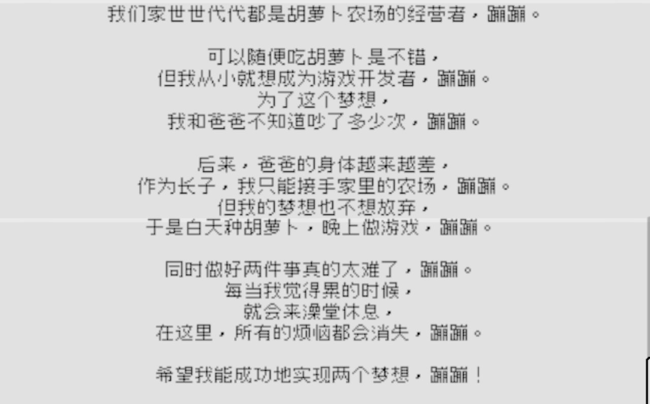 于是,他决定早上种胡萝卜,晚上做游戏,双线并行。每当感到疲惫时,他都会来到我们的澡堂,舒舒服服地泡上一澡,舒缓身上的疲劳。