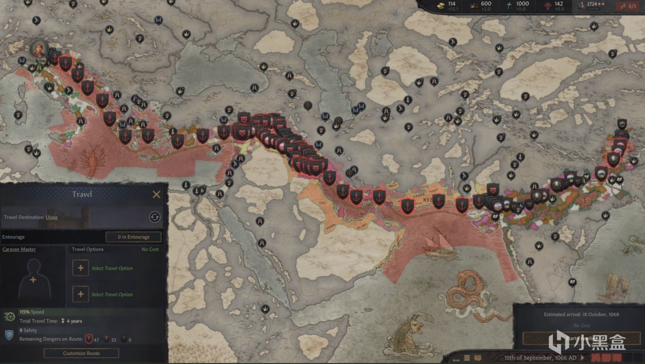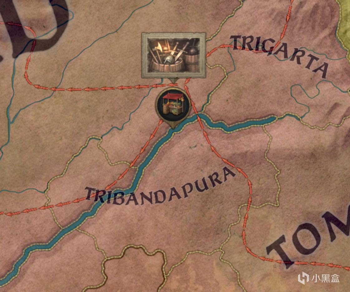 游戏中的丝路路线在地图模式中显示为红色箭头。箭头并非装饰,地方上的敌对行动(例如劫掠)会沿着箭头降低受影响区域的繁荣程度。此地图模式还会显示该区域当前生效中的革新,以及向下一个阶段发展的进度。
