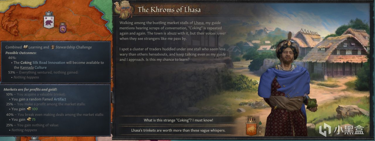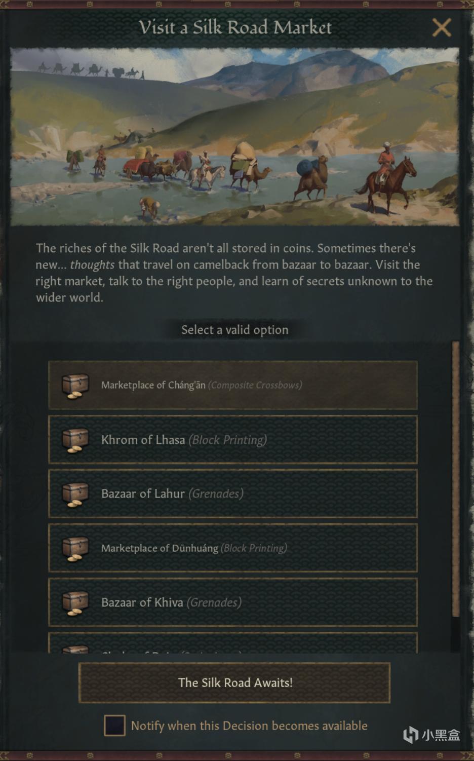 现在,让我们展示一下这具体如何操作,如何解锁火药兵士。第一步是点之前提的“访问丝绸之路市集”决议。点了这个决议,就要真的一路东行到那儿取经!