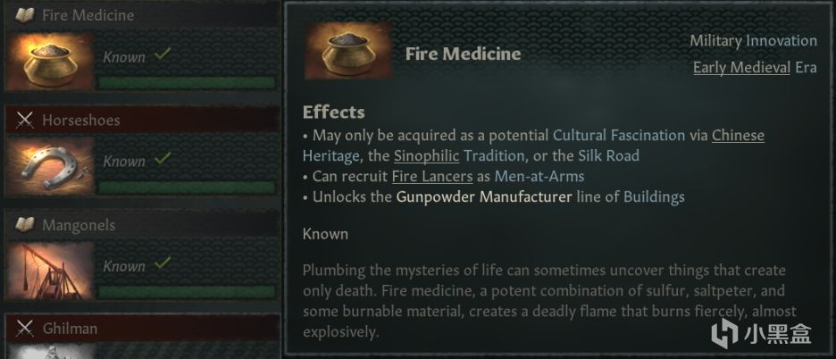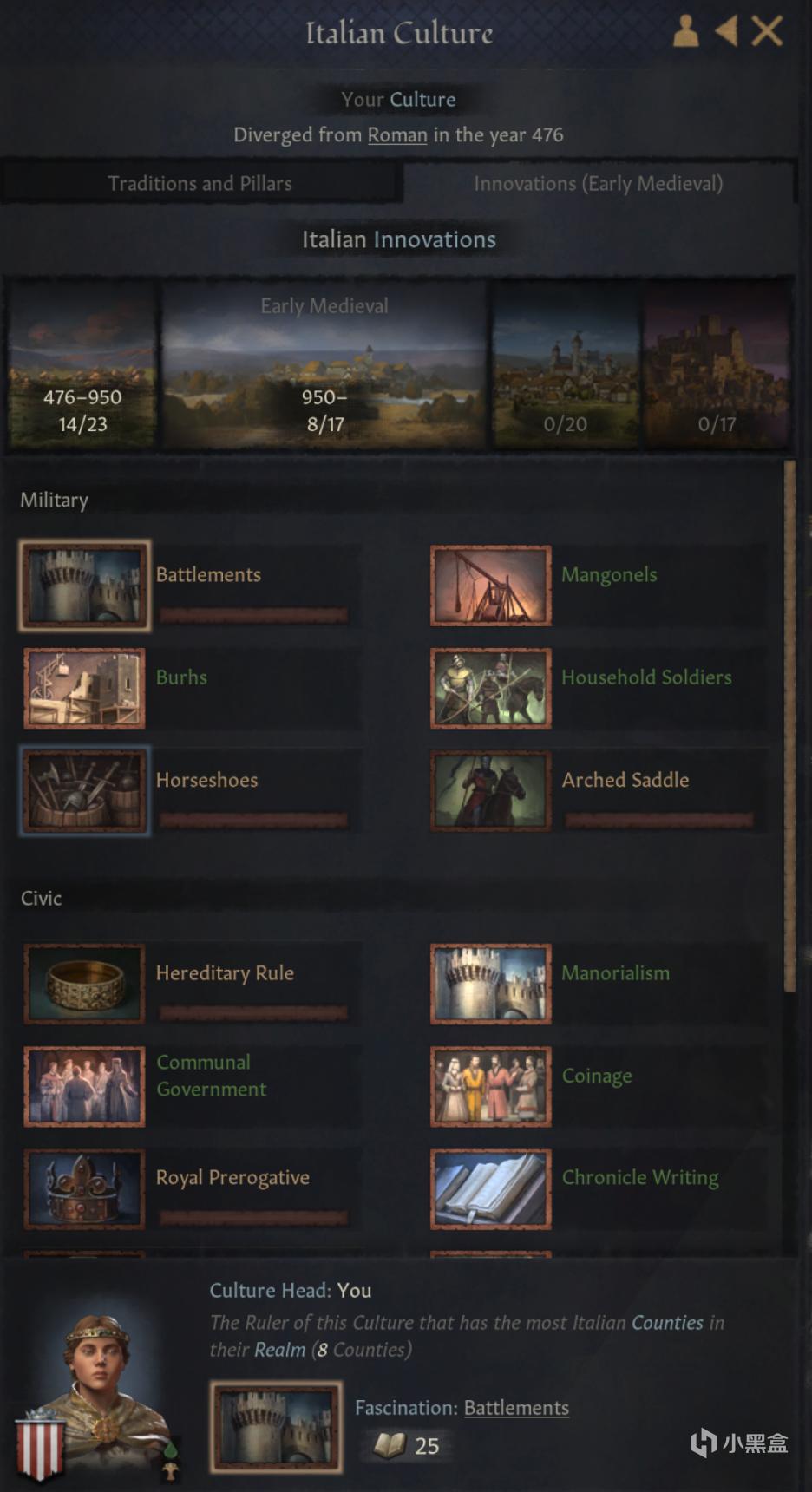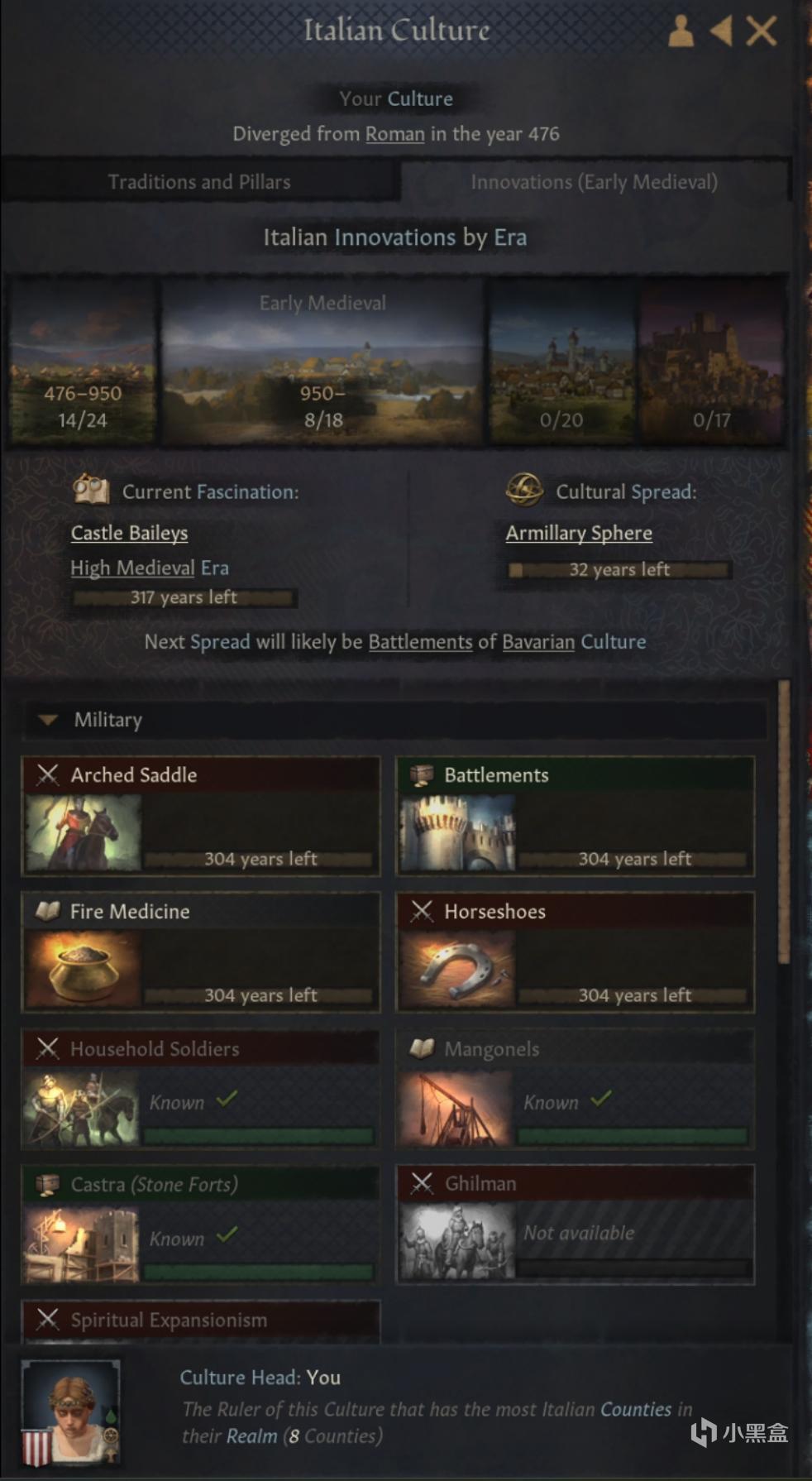 可怜的玛蒂尔达在旅途中生病了,但我们通过了能力检定,并将全新的“火药”革新添加到了自家文化可用的革新库中!现在就可以选择新解锁的革新作为本文化的偏好,最终完成后就可以造一批火器兵士。我们应该持有这个吗?绝对不行。无论如何都要做进游戏吗?当然。
